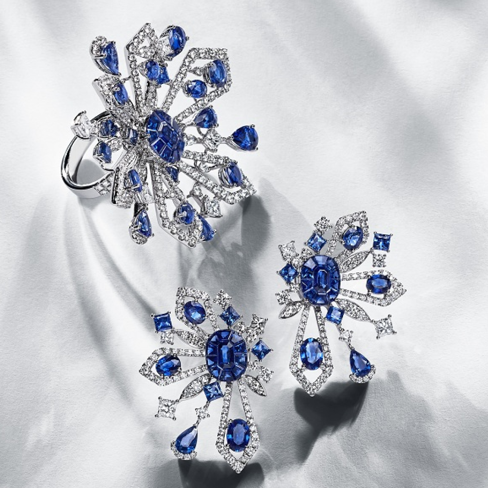 With its captivating blue radiance, sapphire has been the love token of choice among European nobilities for centuries. “I hope to encapsulate in each jewellery piece a scene that stirs the heart and a love that rings true. Azure blue sapphire is used as the main stone and paired with flawless white diamond. The two gemstones have always been symbols of love, and the pairing evokes a fairytale-like romance set in the snowy lands of Northern Europe.” In a departure from conventional snowflake-shaped jewellery, this design discards the typically symmetrical snowflake and imitates the shape of natural quartz. The crux of the snowflake design is made up of six white diamond-studded rhombus shapes in this collection of earrings and ring. The asymmetrical shapes bring a touch of spontaneity and style to the design, while the sapphires at the centre spell an elegant grandeur.