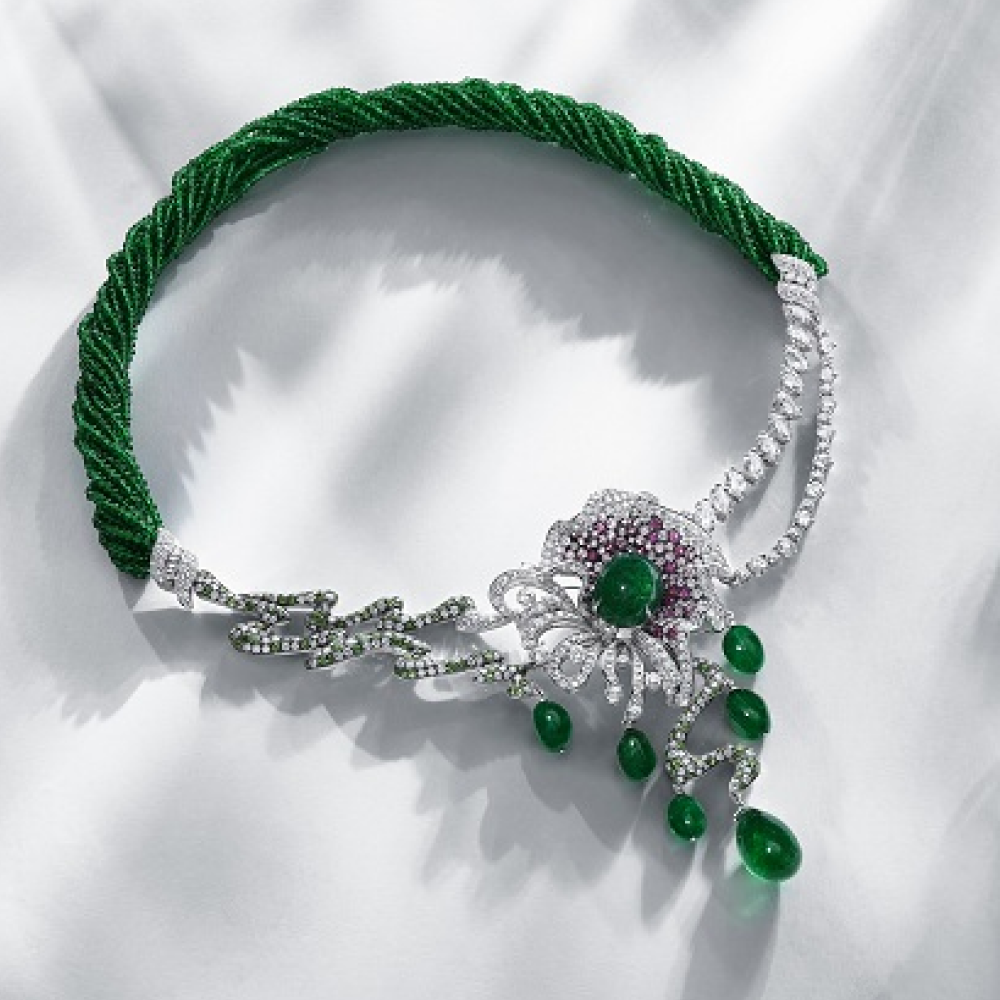 The glamorous banquet is an important part of social culture in the West, and Ms. Yeung has many beautiful memories of the banquet culture from her years of studying abroad. Inspired by sumptuous evening dresses, the design features the classic ribbon and bowknot as the motif and premium emeralds as the axis in this collection of necklace, earrings and ring. The necklace is made up of emerald beaded twists that give out a swirling radiance, like a green ribbon that sways along with the evening dress. At the centre of the necklace is a delicate design that resembles a blooming flower at the first glance. Upon closer look, the white diamond-studded details emerge as intricate bowknots made up of ribbons. The bowknot originated from and it has been an enduring element in fashion, while the ribbon design is enriched with a sense of texture by the intersecting white diamonds. Magenta-colored gemstones of varying hues weave a gorgeous swaying skirt, while the hem is adorned with brilliant white diamonds for a textured display and a feeling of vibrant motion. The resplendent emeralds seize the spotlight at the centre and dangling from the necklace, bringing to mind the grandeur of crystal chandeliers in a banquet hall. The swaying skirt design runs through the entire collection, which is completed with the equally splendid earrings and ring. The jewellery pieces are poised to make the wearer the centre of attention at a lavish banquet.