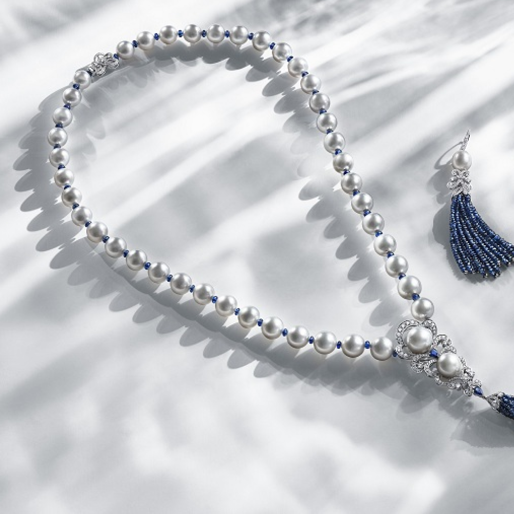 Ms. Yeung’s designs resound with her distinctive character, and their concepts often epitomize the mix of current fashion and classic sensibilities. Educated overseas from an early age, Ms. Yeung is deeply influenced by Western aesthetics and arts, which manifests in her sophisticated ideas about the art of jewellery. In Western mythology, pearl is the gemstone of the Moon God, as pearls were believed to be the tears of the Moon God that trickled down into clam shells. The ancient myth evokes the images of the night sky, the tantalizing moon and a swaying skirt, which coalesce into this collection of elegant and delicate jewellery in Ms. Yeung’s mind. The tassel is the classic of all classic designs in both jewellery and fashion. This design combines the timeless tassel with sapphire, a favorite gemstone among the royals and nobilities of Europe since ancient times, in creating this collection of tassel necklace and earrings that merge contemporary style and classic touches. The necklace is made up of premium pearls that are comparable in color and size, and which are intersected by small sapphire beads. The sapphire beaded tassel sways along the movement of the wearer, echoing the moonlike glow of the immaculate pearls.